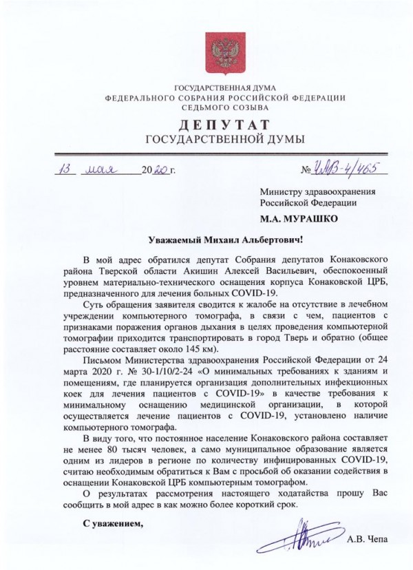 Депутаты от СР озабочены уровнем оснащенности райбольниц в тяжелое время борьбы с коронавирусом. Официально подтвержденные случаи инфекции в разрезе муниципальных образований Тверской области выглядят на 14 мая так: Тверь – 340 человек, Кимры 237, Конаковский район 137, Лихославльский район – 60, Калининский район – 28, Кимрский район 25 человек. Из приведенных данных видно, что хотя в "тройку лидеров" входит курортное Конаково, уровень оснащённости местной ЦРБ не позволяет медикам противостоять COVID-19 на должном в XXI веке уровне. Местные жители через депутата Собрания депутатов Конаковского района от СПРАВЕДЛИВОЙ РОССИИ Алексея Акишина обратились в Государственную Думу к депутату от Тверской области Алексею Чепе. Районный депутат Акишин передал обеспокоенность избирателей уровнем материально-технического оснащения корпуса Конаковской ЦРБ, предназначенного для лечения больных COVID-19. Суть жалобы сводится к отсутствию в лечебном учреждении компьютерного томографа, в связи с чем, пациентов с признаками поражения органов дыхания в целях проведения компьютерной томографии приходится транспортировать в областной центр (город Тверь) и обратно – всего 150 километров. Письмом Министерства здравоохранения Российской Федерации от 24 марта 2020 г. № 30-1/10/2-24 "О минимальных требованиях к зданиям и помещениям, где планируется организация дополнительных инфекционных коек для лечения пациентов с COVID-19", поясняет Алексей Чепа, в качестве требования к минимальному оснащению медицинской организации, в которой осуществляется лечение пациентов с COVID-19, установлено наличие компьютерного томографа. Поэтому, я немедленно обратился к министру здравоохранение Российской Федерации Михаилу Мурашко с просьбой об оказании содействия в оснащении Конаковской ЦРБ компьютерным томографом. Будем надеяться на положительный результат и ждать его в короткие сроки, резюмирует депутат Госдумы Чепа. Население курортного Конаковского района составляет более 80 тысяч человек. Количество жителей на территории традиционно увеличивается в два раза во время отпускного сезона, что нашло подтверждение в период режима повышенной готовности, когда из московской агломерации в Конаковский район на самоизоляцию устремились десятки тысяч граждан. В силу этого фактора муниципальное образование вошло в число лидеров Верхневолжья по количеству инфицированных COVID-19, поэтому "...отсутствие КТ в этом респектабельном и известном курортном месте выглядит, по меньшей мере, разгильдяйством", полагает возмутитель спокойствия в Конаково депутат Акишин. Остаётся надеяться, добавляет Алексей Акишин, что вмешательство депутата Госдумы и внимание федерального Минздрава изменит ситуацию к лучшему ![]() |