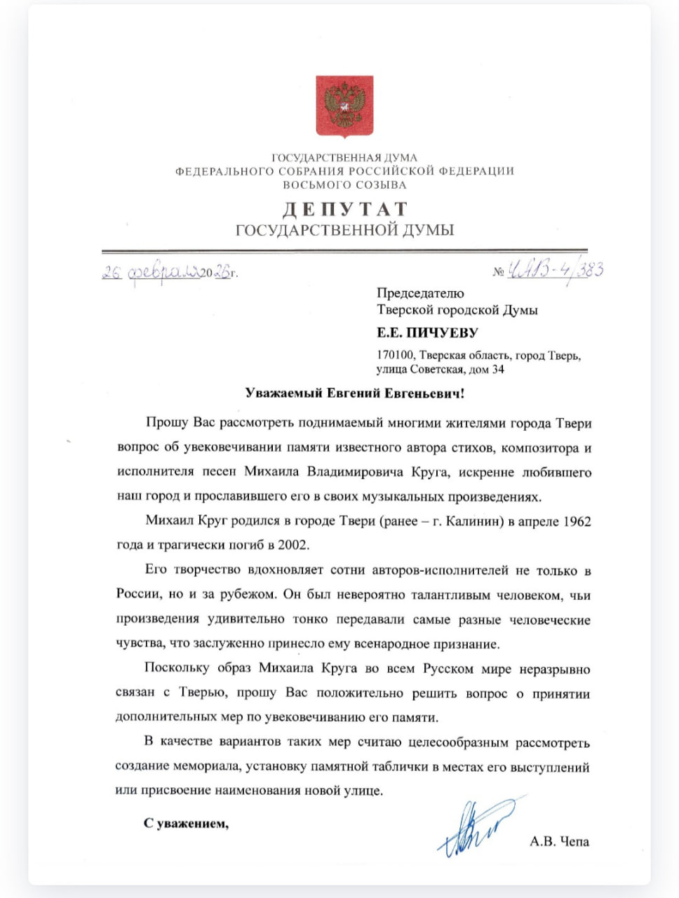 Алексей Чепа выступил с инициативой увековечить имя Михаила Круга в топонимике города Твери