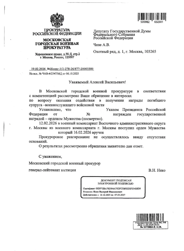 "Вдова погибшего военнослужащего обратилась в мой адрес с просьбой оказать содействие во вручении Ордена Мужества, которым посмертно был награжден её супруг, погибший при исполнении воинского долга в зоне проведения Специальной военной операции.